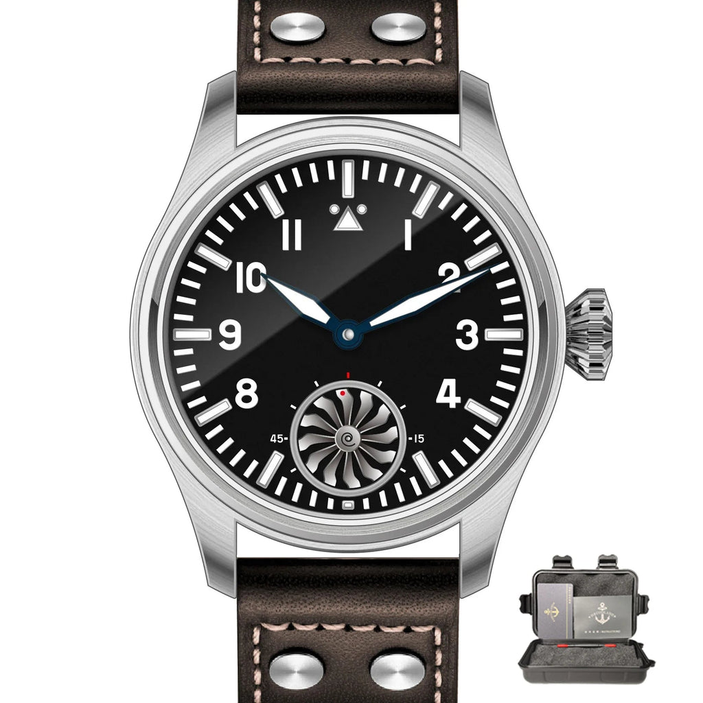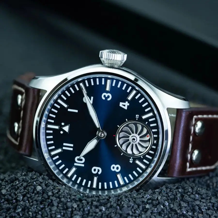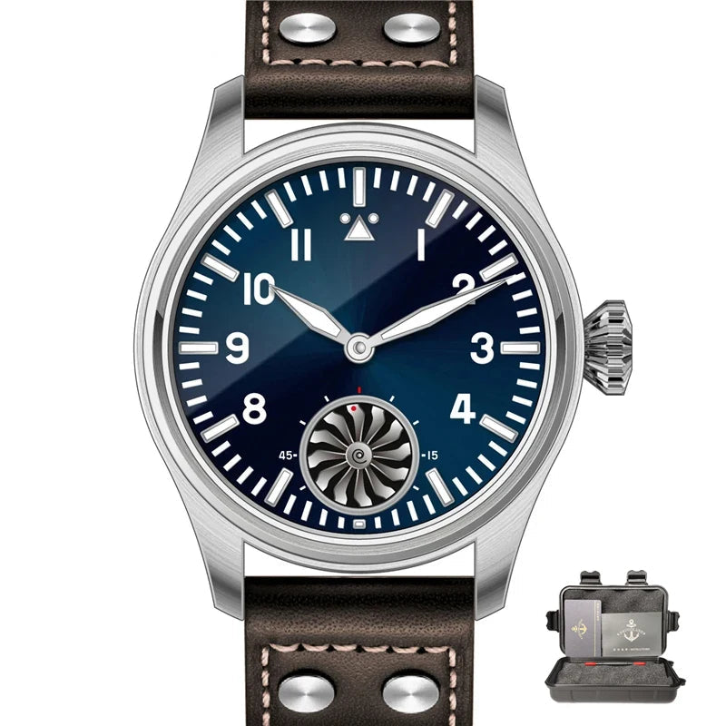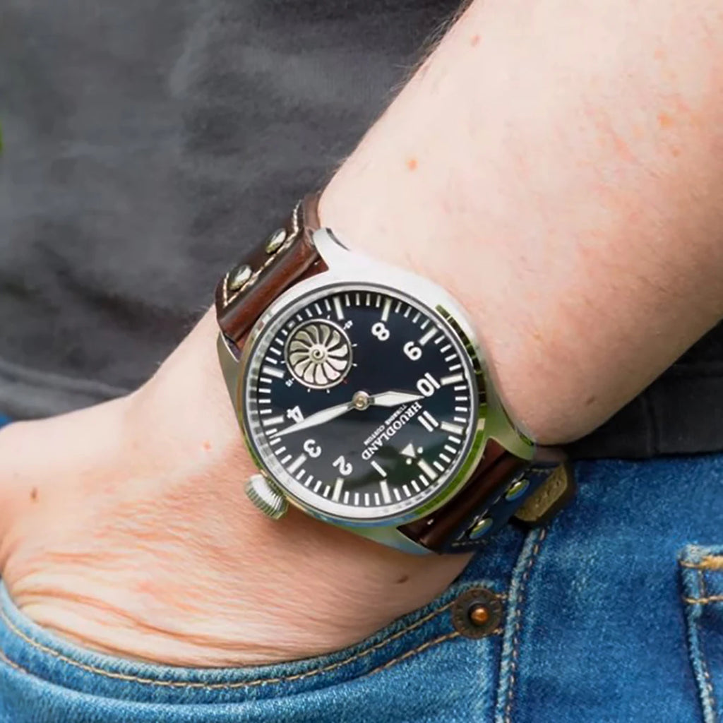 This 44mm 316L stainless steel case houses a turbine-style subdial, capturing the motion and energy of bomber cockpit systems. A fluted crown and luminous hands ensure legibility and grip, even in the darkest moments of the mission.