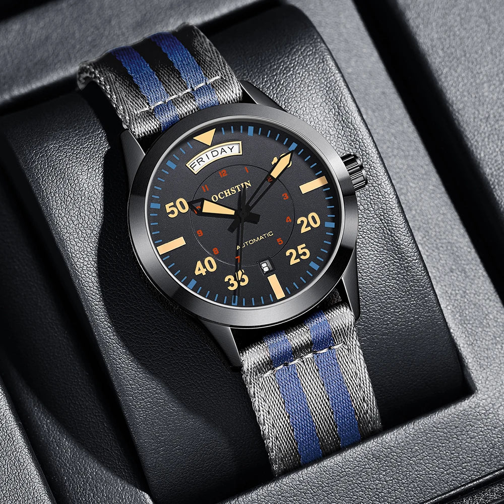 With its high-visibility Arabic markers, bold day-of-week aperture, and tactical 24mm NATO strap, the P-51 Tactical Day-Date is designed for absolute legibility under pressure. The luminous hands and reinforced case take cues from cockpit controls and pilot chronometers.