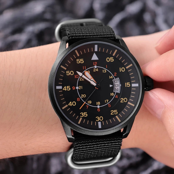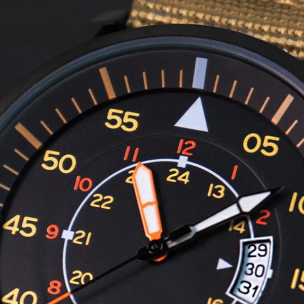 Inspired by the instruments of British reconnaissance pilots, this model features a dual-scale dial — inner 24-hour and outer minute track — ideal for operations across multiple time zones. The stealth-black alloy case with matte finish resists glare under pressure, while the tactical-grade nylon strap offers durability and all-day comfort.