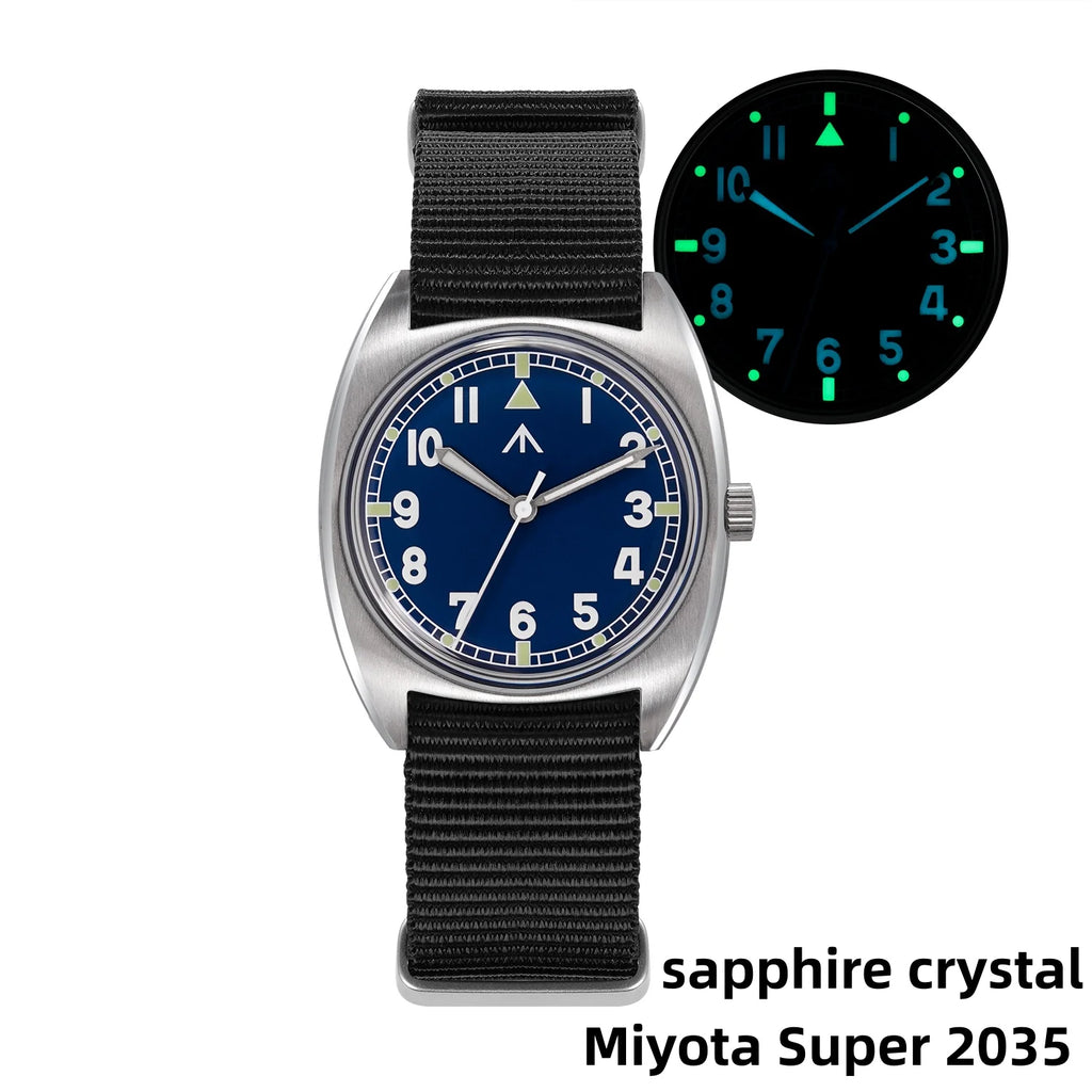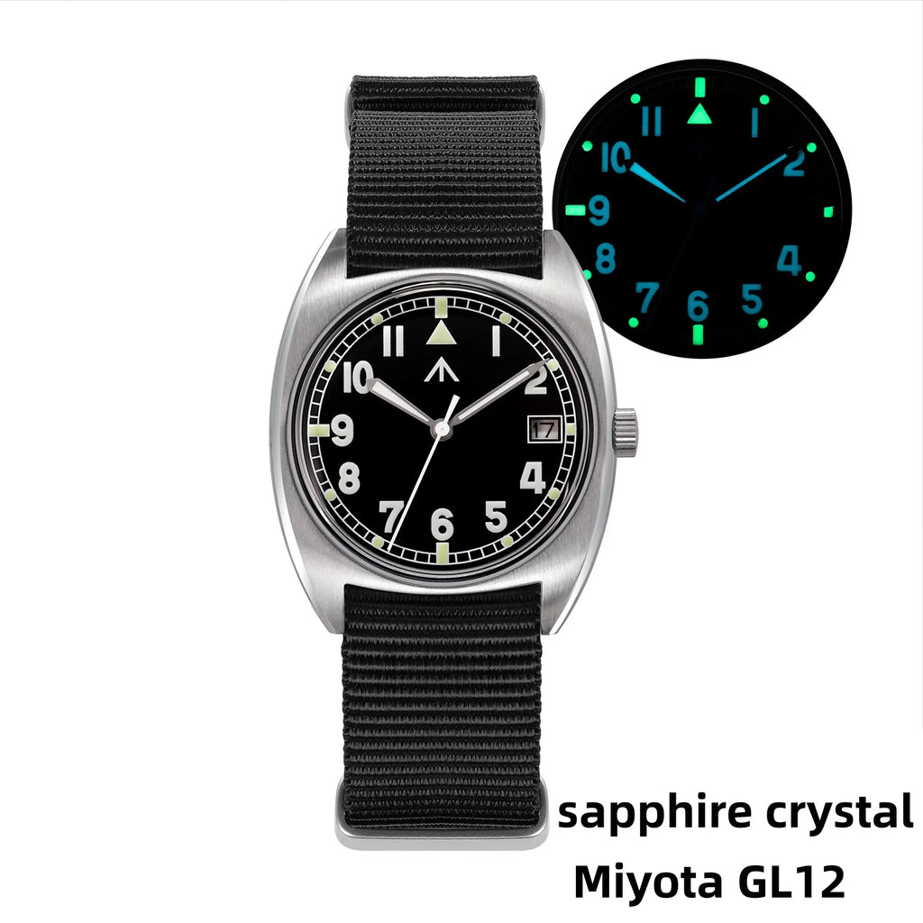 The cushion (tonneau) 36 mm 316L stainless-steel case echoes classic MOD-issued field watches. A high-clarity K1 “bubble” crystal with AR coating protects the deep-black dial, while the broad-arrow at 12, bold Arabic numerals and Swiss Super-LumiNova® C3 + BGW9 ensure day-night readability. The screw-down crown and 100 m water resistance make it mission-ready—street, field or flight line.