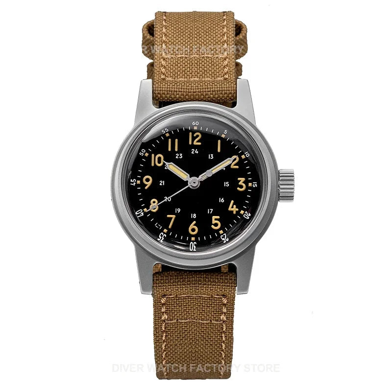 A sandblasted 316L stainless-steel case at a historically faithful 36 mm anchors a dial built for clarity under pressure. The domed acrylic “bubble” crystal delivers authentic WWII character, while Super-LumiNova C3 hands and markers secure day–night legibility. A rugged 18 mm fabric field strap completes a watch designed to be worn—hard.